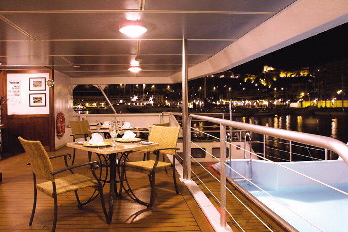 The lower deck (Hibiscus) features a comfortable dining saloon while a swimming pool in the stern. There is also a formal entry foyer, beauty spa, boutique and guest laundry.